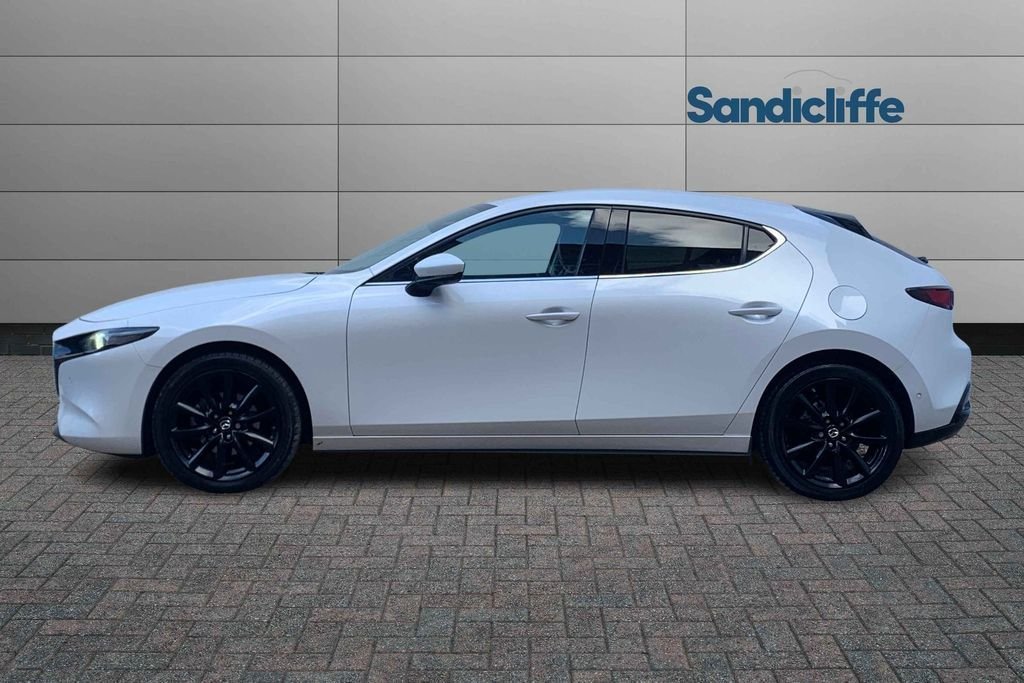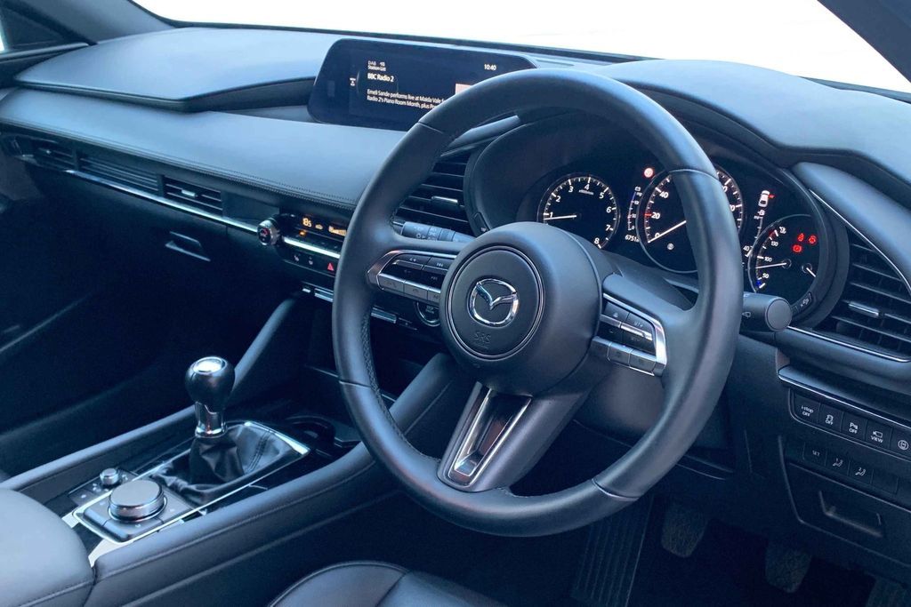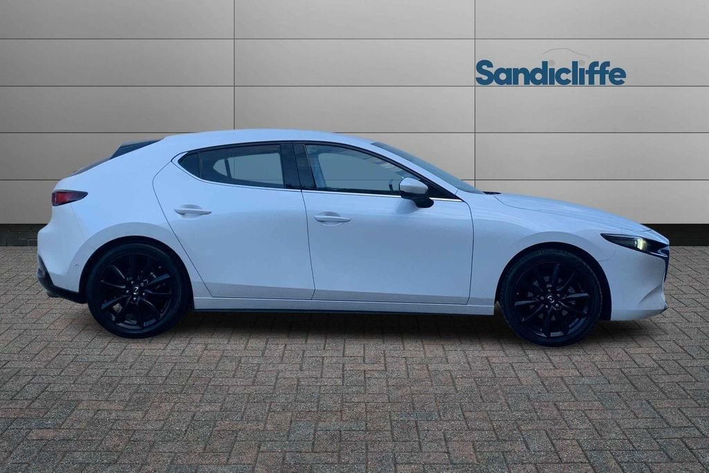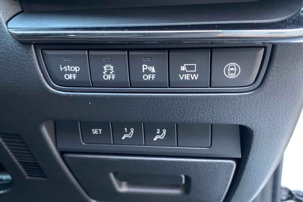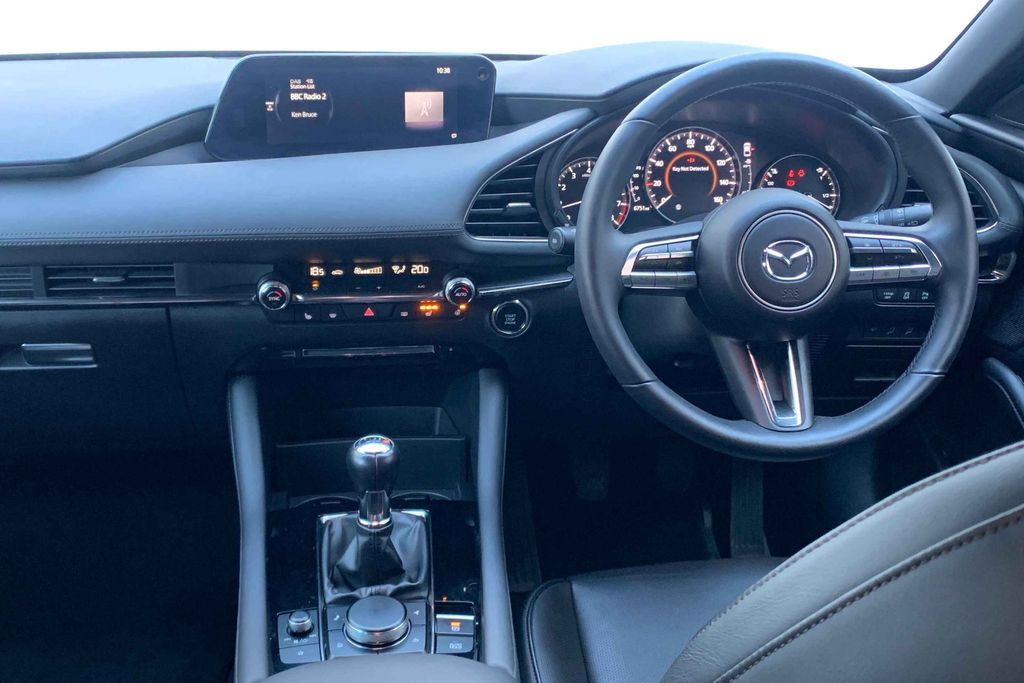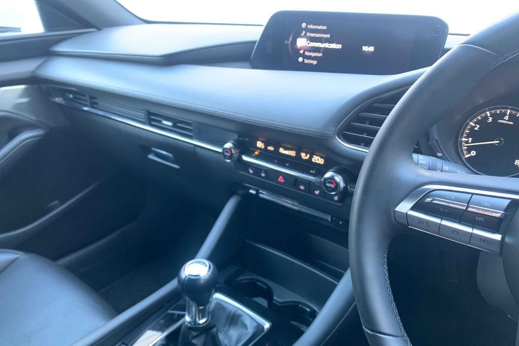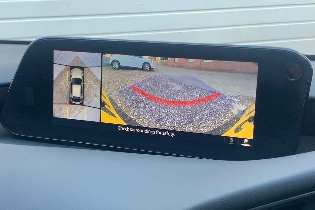18" Black metallic alloy wheels, 3 point ELR front seatbelts with pretensioners, 3 rear 3 point seatbelts with ELR, 360 View Monitor, 60/40 split fold down rear seats, 7" colour TFT display, 8 way power adjustable driver with door mirror memory and active driving display, 8.8" Colour centre touch screen display with Mazda Connect infotainment, Adaptive LED Headlights, Anti-lock braking system (ABS), Apple car play/Android Auto, Audio transfer from bluetooth devices, Auto dimming door mirrors, Auto door lock when driving, Blind spot monitoring with rear cross traffic alert, Chrome centre bezel steering wheel, Chrome-plated glovebox handle, Colour active driving display inc Windscreen projected,Traffic Sign Recognition, turn-by- turn navigation and Mazda Radar Cruise Control information, Coming/leaving home lighting function, Cruising Traffic Support, Dark metallic finish signature wing, Daytime running lights, Digital instrument cluster, Door mirrors with adjustable memory and tilt-down function when reversing, Driver attention alert system with camera, Driver monitoring system, Driver, Front passenger and two rear grab handles with coathooks, Driver/passenger sunvisors + vanity mirrors (drivers side with ticket holder), Drivers knee airbag, DSC - Dynamic Stability Control, Dual front airbags, Dual zone climate control air conditioning, Dusk sensing headlights, E-call with GPS, EBD - Electronic brakeforce distribution, Electric front/rear windows with one touch/auto up/down, Electrical power outlet, Electrically adjustable/heated/auto power folding door mirrors with integrated indicators, Electronic parking brake with auto disengage function and auto hold function, Emergency stop signalling system, Emergency tyre repair kit, Engine start/stop button, Folding rear centre armrest with two cup holders, Frameless auto dimming interior rear view mirror, Front and rear courtesy lamps, Front and rear curtain airbags, Front and rear parking sensors, Front armrest, Front body coloured bumper with black/bright lower bezel, Front centre console with storage box with tray, lid + 2 cupholders, Front Cross Traffic Alert, Front head restraints, Front passenger airbag cut-off switch, Front passengers seat manual slide, recline and height adjustment, Front side airbags, Front smart city brake support, G-Vectoring control plus, Gear shift indicator, Gloss black mesh grille, Gloss black rear roof spoiler, Head up Display, Heated steering wheel, High beam assist, Hill launch assist, Illuminated glovebox, Integrated bluetooth with steering wheel mounted controls, Intelligent speed assist, Intelligent Traction Control system, ISOFIX child seat anchorage points attached on outer rear seats, Lane keep assist system (LAS) with Lane departure warning system (LDWS), Leather wrapped gear shift knob, Leather wrapped steering wheel, LED headlamps with auto levelling, LED indicator lights, LED interior light, LED third brake light, Luggage compartment light, Mazda Multimedia System with AM / FM / DAB radio, single CD / MP3 with 12 Speaker Bose sound system, bose centerpoint, bassmatch+audiopilot technology, Mazda Navigation System with european mapping, Mazda Radar Cruise Control, Mild Hybrid system with regenerative braking, Mobile App interface, Multimedia Commander, PAS, Piano black window garnish, Power driver lumbar adjustment, Privacy glass with dark tinting on rear side windows and rear window, Rain sensing front wipers, Reach adjustable steering wheel, Rear cross traffic braking, Rear fog lights, Rear gloss black lower moulding, Rear smart city brake support, Remote central locking + deadlocks, Reversing camera, Seatbelt reminder for driver/front passenger and rear seats, Service indicator, Signature LED lights, Signature LED rear combination lights with LED rear turn lights, Smart Keyless entry and start, Speed adjustable rear wash wiper with intermittent wipe, Start/stop button chrome surround, Storage - glovebox, driver and front passenger door pockets and roof mounted sunglasses holder, Thatcham accredited alarm and immobiliser, Three height adjustable rear head restraints, Tilt/height adjustable steering wheel, Trip computer, Tyre pressure monitoring system (TPMS), USB charging point