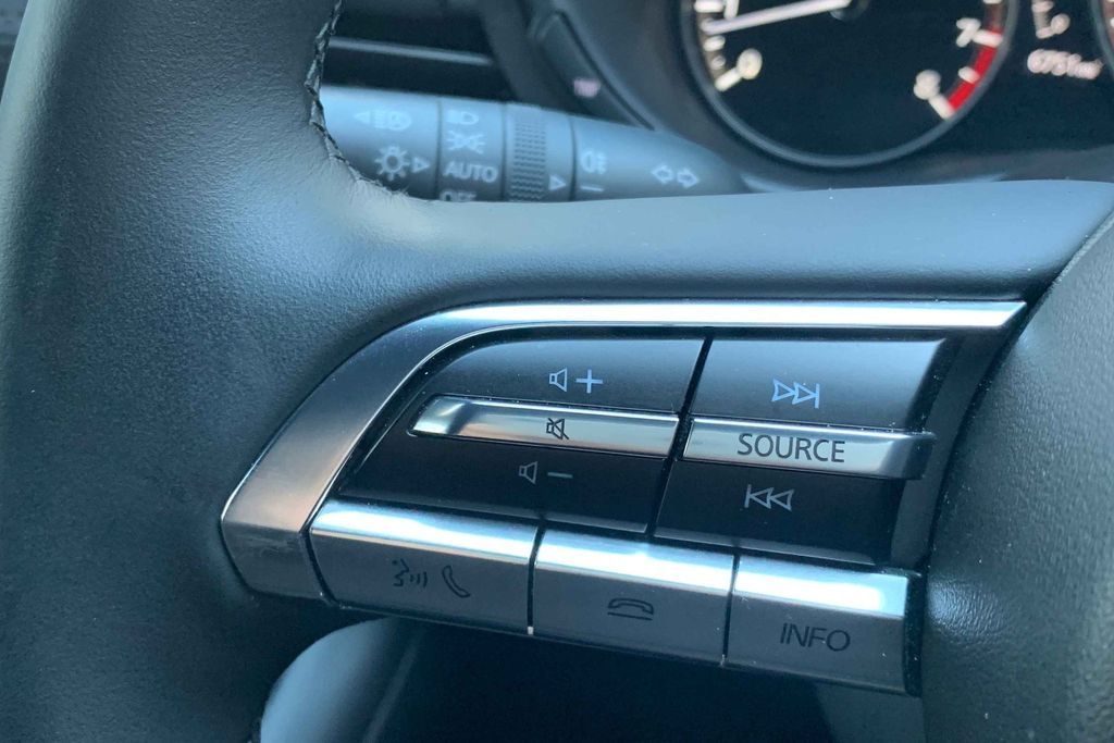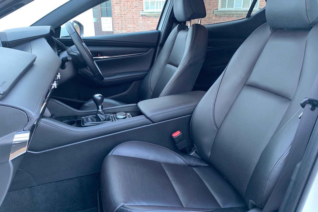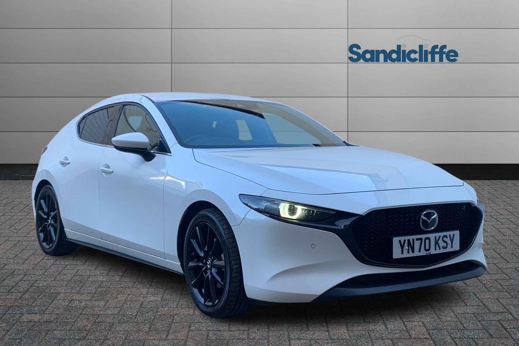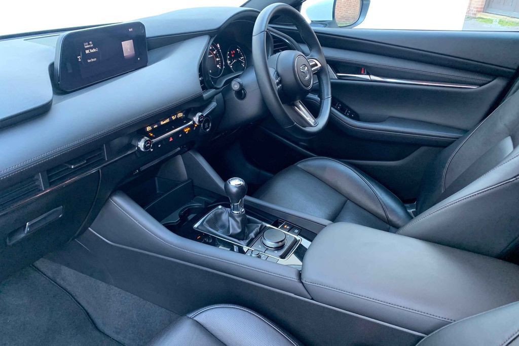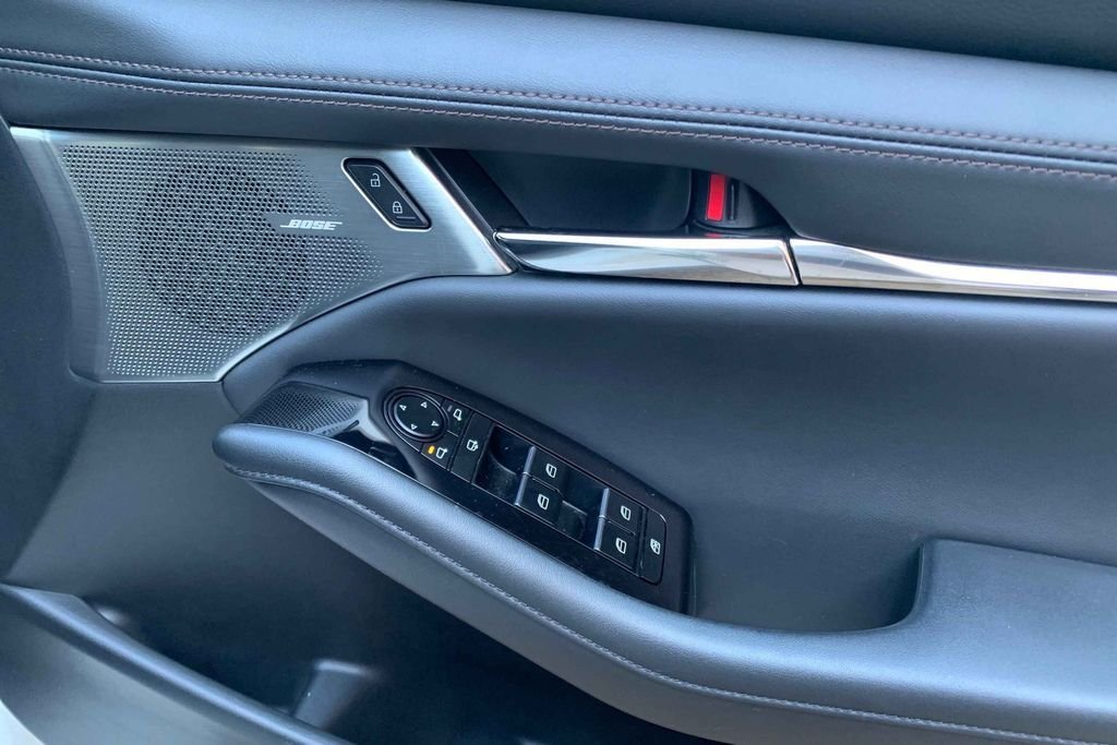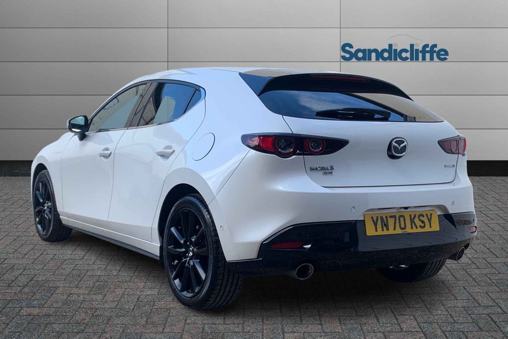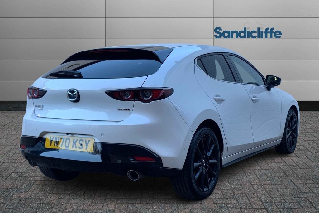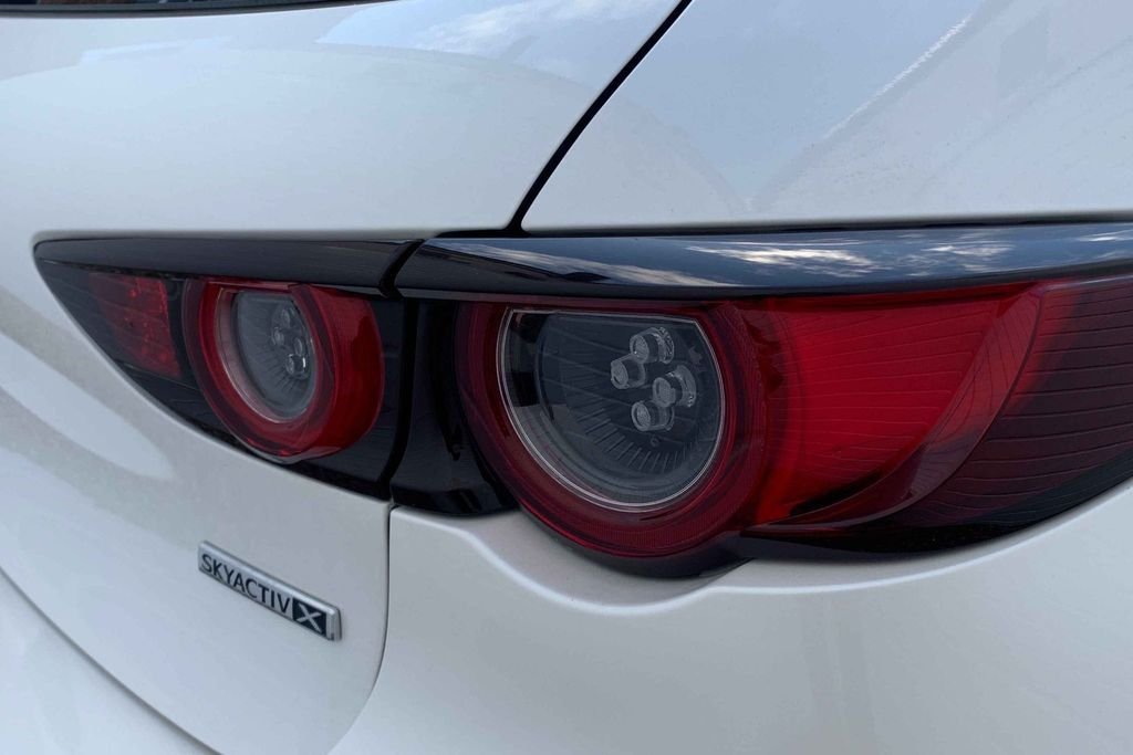 18" Black metallic alloy wheels, 3 point ELR front seatbelts with pretensioners, 3 rear 3 point seatbelts with ELR, 360 View Monitor, 60/40 split fold down rear seats, 7" colour TFT display, 8 way power adjustable driver with door mirror memory and active driving display, 8.8" Colour centre touch screen display with Mazda Connect infotainment, Adaptive LED Headlights, Anti-lock braking system (ABS), Apple car play/Android Auto, Audio transfer from bluetooth devices, Auto dimming door mirrors, Auto door lock when driving, Blind spot monitoring with rear cross traffic alert, Chrome centre bezel steering wheel, Chrome-plated glovebox handle, Colour active driving display inc Windscreen projected,Traffic Sign Recognition, turn-by- turn navigation and Mazda Radar Cruise Control information, Coming/leaving home lighting function, Cruising Traffic Support, Dark metallic finish signature wing, Daytime running lights, Digital instrument cluster, Door mirrors with adjustable memory and tilt-down function when reversing, Driver attention alert system with camera, Driver monitoring system, Driver, Front passenger and two rear grab handles with coathooks, Driver/passenger sunvisors + vanity mirrors (drivers side with ticket holder), Drivers knee airbag, DSC - Dynamic Stability Control, Dual front airbags, Dual zone climate control air conditioning, Dusk sensing headlights, E-call with GPS, EBD - Electronic brakeforce distribution, Electric front/rear windows with one touch/auto up/down, Electrical power outlet, Electrically adjustable/heated/auto power folding door mirrors with integrated indicators, Electronic parking brake with auto disengage function and auto hold function, Emergency stop signalling system, Emergency tyre repair kit, Engine start/stop button, Folding rear centre armrest with two cup holders, Frameless auto dimming interior rear view mirror, Front and rear courtesy lamps, Front and rear curtain airbags, Front and rear parking sensors, Front armrest, Front body coloured bumper with black/bright lower bezel, Front centre console with storage box with tray, lid + 2 cupholders, Front Cross Traffic Alert, Front head restraints, Front passenger airbag cut-off switch, Front passengers seat manual slide, recline and height adjustment, Front side airbags, Front smart city brake support, G-Vectoring control plus, Gear shift indicator, Gloss black mesh grille, Gloss black rear roof spoiler, Head up Display, Heated steering wheel, High beam assist, Hill launch assist, Illuminated glovebox, Integrated bluetooth with steering wheel mounted controls, Intelligent speed assist, Intelligent Traction Control system, ISOFIX child seat anchorage points attached on outer rear seats, Lane keep assist system (LAS) with Lane departure warning system (LDWS), Leather wrapped gear shift knob, Leather wrapped steering wheel, LED headlamps with auto levelling, LED indicator lights, LED interior light, LED third brake light, Luggage compartment light, Mazda Multimedia System with AM / FM / DAB radio, single CD / MP3 with 12 Speaker Bose sound system, bose centerpoint, bassmatch+audiopilot technology, Mazda Navigation System with european mapping, Mazda Radar Cruise Control, Mild Hybrid system with regenerative braking, Mobile App interface, Multimedia Commander, PAS, Piano black window garnish, Power driver lumbar adjustment, Privacy glass with dark tinting on rear side windows and rear window, Rain sensing front wipers, Reach adjustable steering wheel, Rear cross traffic braking, Rear fog lights, Rear gloss black lower moulding, Rear smart city brake support, Remote central locking + deadlocks, Reversing camera, Seatbelt reminder for driver/front passenger and rear seats, Service indicator, Signature LED lights, Signature LED rear combination lights with LED rear turn lights, Smart Keyless entry and start, Speed adjustable rear wash wiper with intermittent wipe, Start/stop button chrome surround, Storage - glovebox, driver and front passenger door pockets and roof mounted sunglasses holder, Thatcham accredited alarm and immobiliser, Three height adjustable rear head restraints, Tilt/height adjustable steering wheel, Trip computer, Tyre pressure monitoring system (TPMS), USB charging point