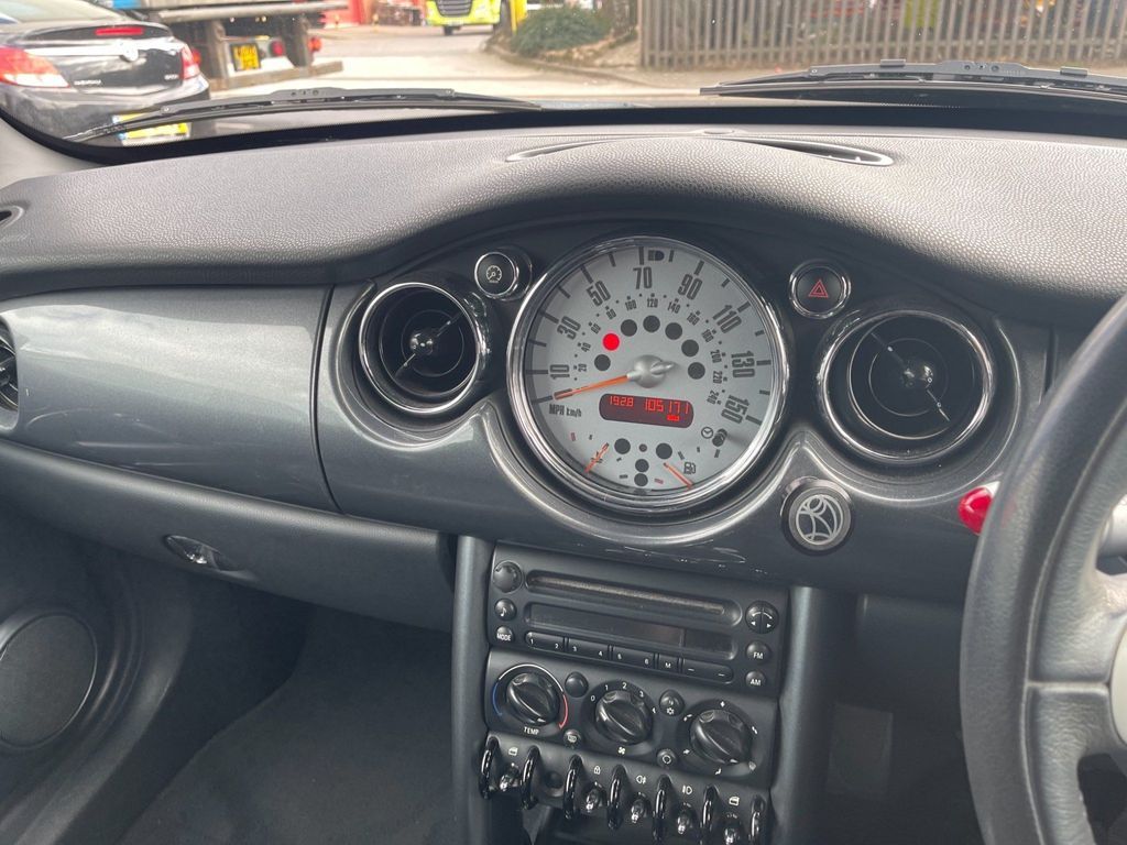 'Guide me home' headlamps, 'Lights On' Reminder warning buzzer, 2 rear head restraints, 3 spoke sports leather steering wheel, 50/50 split folding rear seat, ABS+Electronic Brake force Distribution, Adjustable intermittent wipers, Air recirculation control, Anthracite Velour floor mats, ASC+T, Automatic door locking, Auxiliary socket for external MP3 player, Black hood, Body coloured bumpers, Body coloured door mirrors, Brake wear warning light, Brushed steel door sill finishers, CBC - (Cornering brake control), Central locking fuel filler cap, Chrome door handles, Chrome grille surround, Chrome line interior, Chrome plated exhaust pipe, Chrome plated radiator grille, Crash Sensor - activates hazard/interior lighting + unlocks doors, Cupholders in centre console, Digital clock, Driver/front passenger airbag, Driver/front passenger side airbags, Driver/pass recline/slide manual adj seats, Easy entry seats, Electric door mirrors, Electric windows, Electronic engine immobiliser, English leather upholstery, Front fog lamps, Front footwell lights, Front head restraints, Front passenger seat height adjust, Front seatbelt pretensioners, Front sports seats, Fully automatic soft top, Green tinted heat insulating glass, Heated rear window, Height adjustable driver's seat, Height adjustable steering wheel, Interior lights package - MINI, Interior switch for central locking, Isofix child seat attachment, LCD odometer/tripmeter, Lockable glovebox, Low washer fluid indicator, Luggage compartment lighting, Lumbar support, MINI Storage compartment pack, Multifunction steering wheel inc cruise control, On board computer, PAS, Passenger airbag deactivation system, Radio BOOST, Radio/CD + MP3, Rear park distance control, Remote central locking, Remote control alarm, Rev counter, Roll over protection, Run flat indicator, Run-flat tyres, Service interval indicator, Sidewalk interior trim, Smoker pack - MINI Convertible, Storage compartment underneath steering column, Storage compartments in doors, Sun visors, Third brake light, Tool kit, Twin horns, White indicator lights