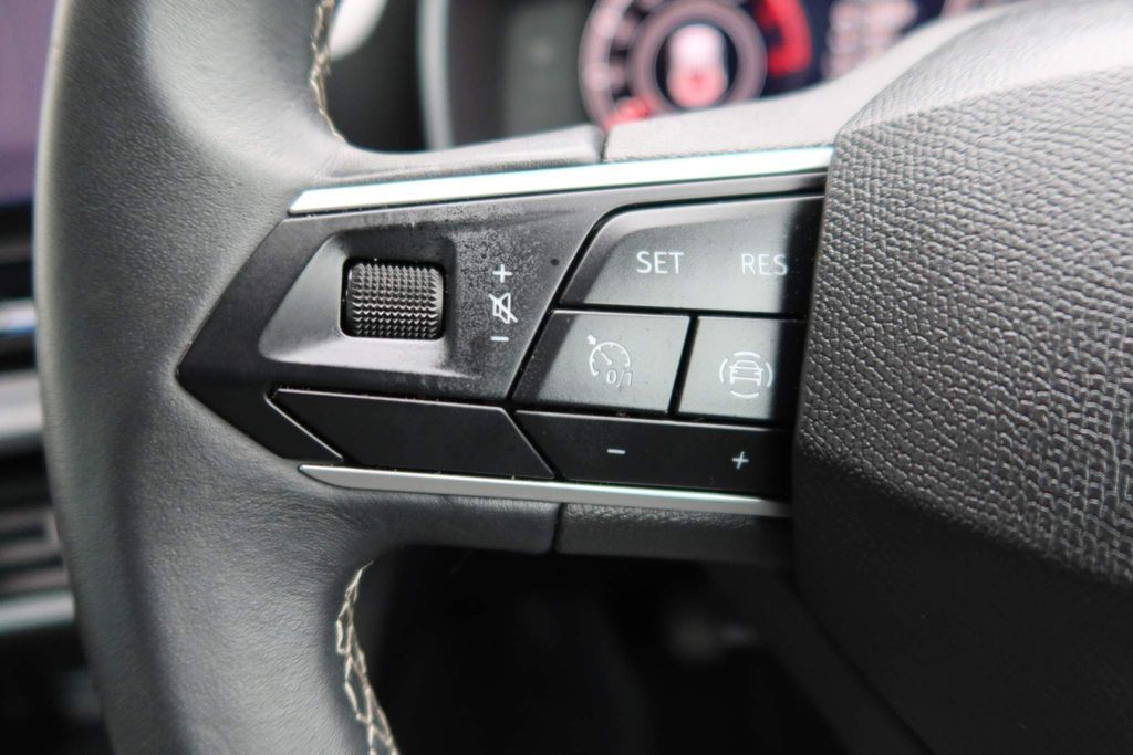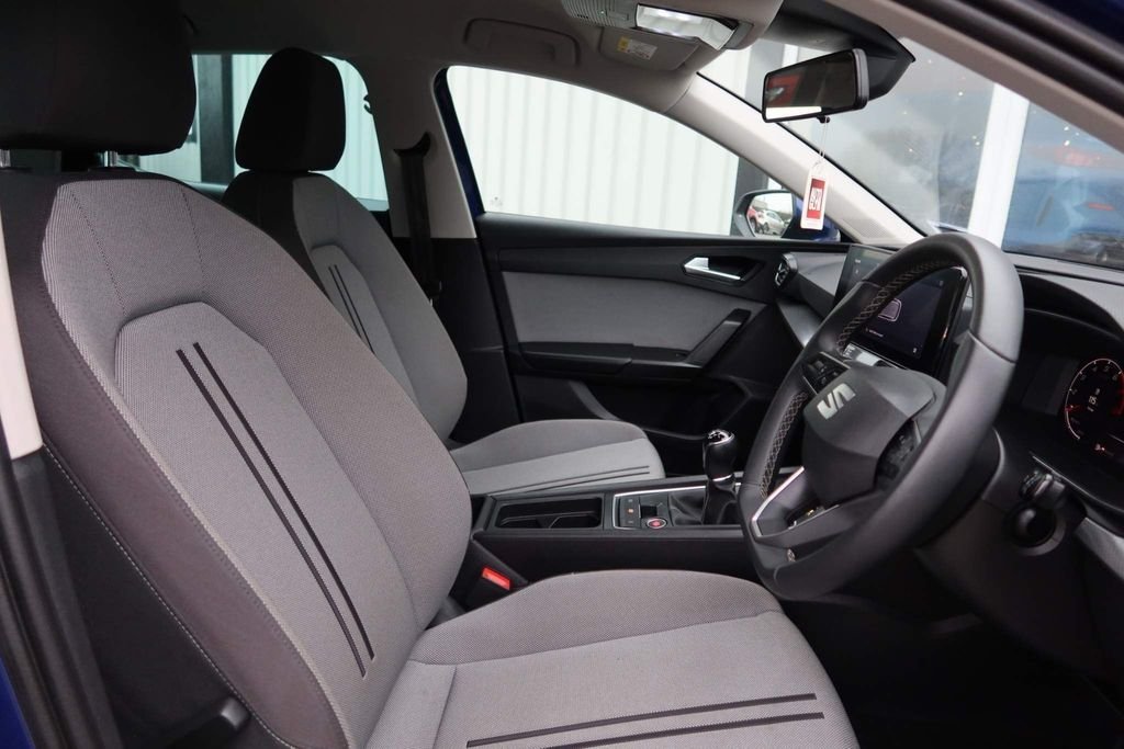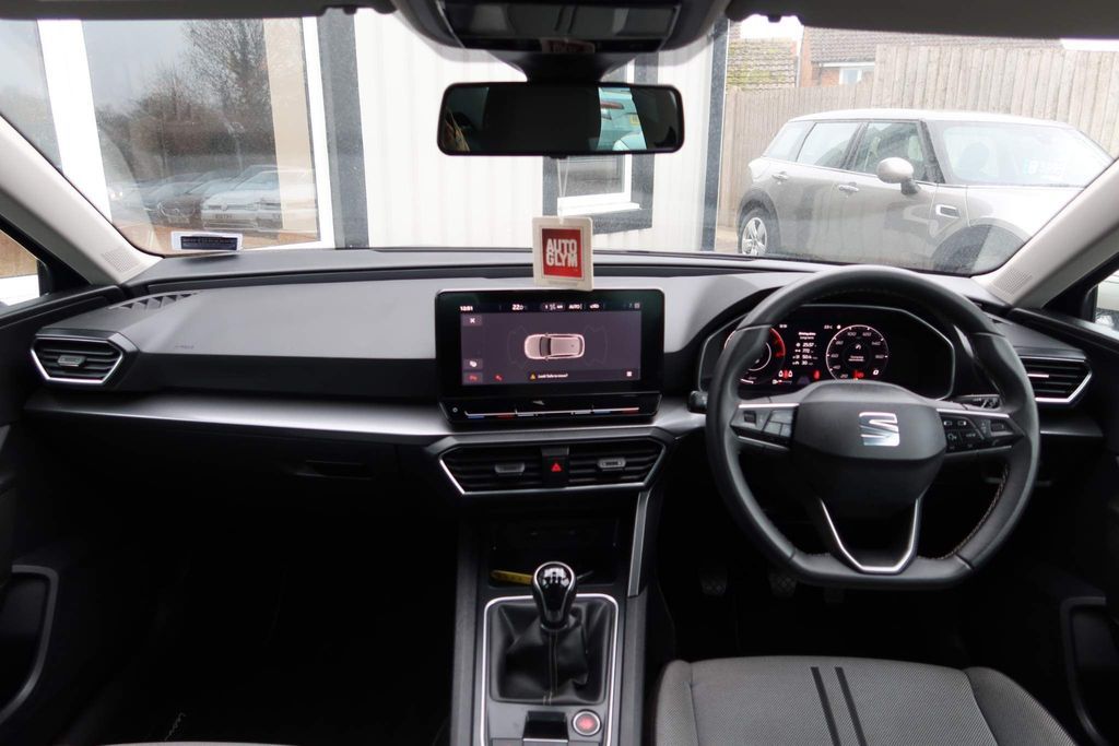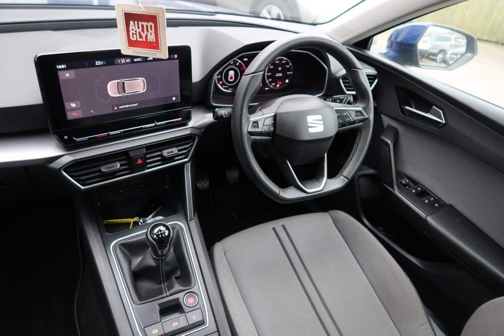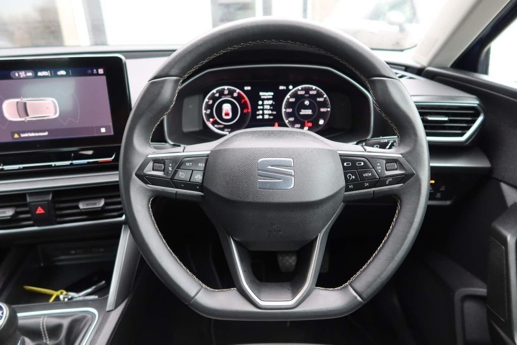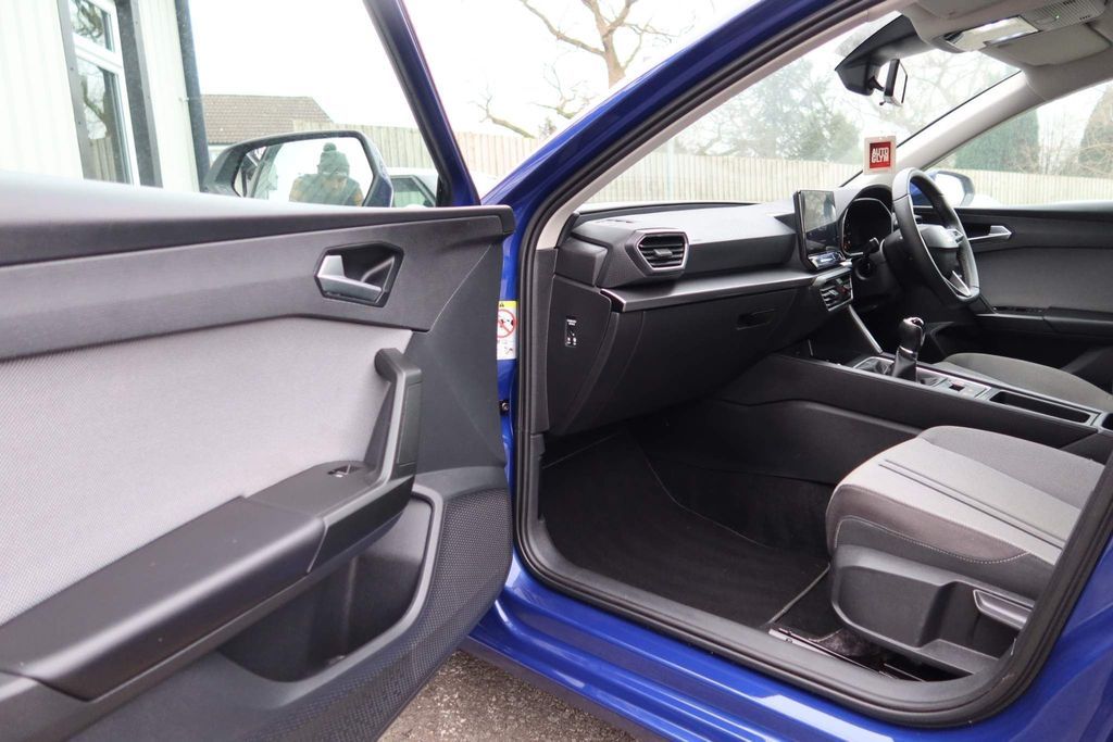 12v power point in centre console, 17" Dynamic tri-spoke alloy wheels with 91W tyres, 3 point seatbelts on all rear seats, 60/40 split rear bench seat, ABS, Air conditioning, Anti theft alarm system with interior monitoring in cab, backup horn and towing protection, Auxiliary input socket, Body coloured bumpers, Body coloured door handles, Body coloured exterior mirrors with integrated LED indicators, Brake control system - ESC and brake booster, Child proof door locks, Chrome interior detailing, Cloth upholstery, Cruise control with speed limiter, Dark tinted rear windows, Digital cockpit, Driver and front passenger airbags with front passenger airbag de-activation, front side and curtain airbags, Driver seat lumbar adjustment, Driver/passenger manual seat height adjustment, Dust/pollen filter, Electric front/rear windows, Electrically adjustable and heated door mirrors, Electronic parking brake, Extended safety system - seat belt tensioner, window closure and hazard lights, Folding boot cover, Front and rear height adjustable headrests, Front and rear reading lights X 4, Front assist with forward collision warning braking reaction to vehicles, pedestrians and cyclists, Front seatback storage pockets, Full link smartphone integration with Mirror Link, wireless Apple CarPlay and wired Google Android Auto, Height/reach adjust steering wheel, Hill hold control, Interior lighting with LED lighting in sunvisor, glovebox and rear headlining, ISOFIX points in outer rear seats with top tether anchorage points, KESSY Go (Keyless start), Lane keeping system, Leather flat bottomed, perforated steering wheel and leather gearstick, LED front fog lamps with cornering function, LED headlights and LED tail lights, LED rear fog lamp, Lockable tailgate, Locking wheel bolts, Luggage tie-down hooks, Manual dimming rear view mirror, Media system plus with navigation - Leon SE, Park assist (inc front/rear parking sensors), Power assisted speed sensitive electro-mechanical steering, Rear disc brakes, Rear wash/wipe, RPM, trip computer, outside temp gauge, instrument light brightness, low fuel warning light, lights on reminder, gearshift indicator, Seat belt reminder for front and rear seats, Separate daytime running light with automatic headlight control, Service interval indicator, Standard suspension, Start/stop system with regenerative braking, Sunvisors with covered illuminated mirror, Tiredness recognition system, driver alert system, Tool kit, Tyre pressure monitoring system, XDS electronic differential lock and dynamic traction support